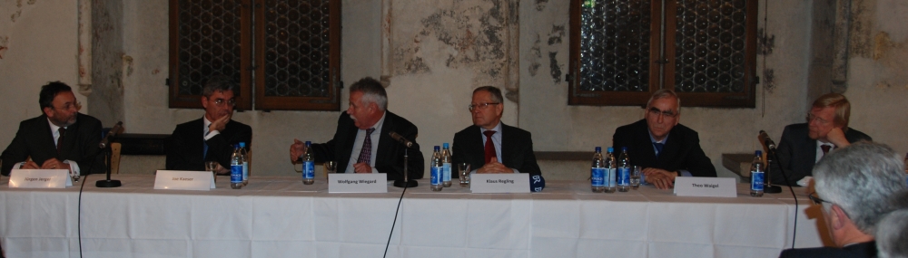 Auch Wolfgang Wiegard, lange Jahre Professor an der Uni Regensburg und zwischen 2005 und 2011 im Sachverständigenrat für Wirtschaft, war verhalten optimistisch, was die Überwindung der Krise anbelangt. „Auf EU-Ebene wurden ganz vernünftige Schritte gemacht. Die zentralen Bausteine, um die Krise in den Griff zu bekommen, sind vorhanden.“ Er zählte drei Maßnahmen auf, die von entscheidender Bedeutung sein können: Der Europäische Stabilitätsmechanismus, der langfristig wirkende Fiskalpakt, der die in Deutschland verabschiedete Schuldenbremse auch auf andere Länder überträgt und an deren Konstruktion er maßgeblich beteiligt war, und die Ankündigung des Präsidenten der Europäischen Zentralbank, Mario Monti, Outright Monetary Transactions (OMT) durchzuführen, die kurzfristig helfen sollen. „Eine Garantie gibt es aber auch mit diesem Instrumentarium nicht“, stellte Wiegard klar, „denn damit ist das Instrumentarium ausgereizt.“ Für ihn ist es fraglich, ob weitergehende Schritte, wie zum Beispiel Eurobonds, rechtlich mit dem Grundgesetz vereinbar seien.