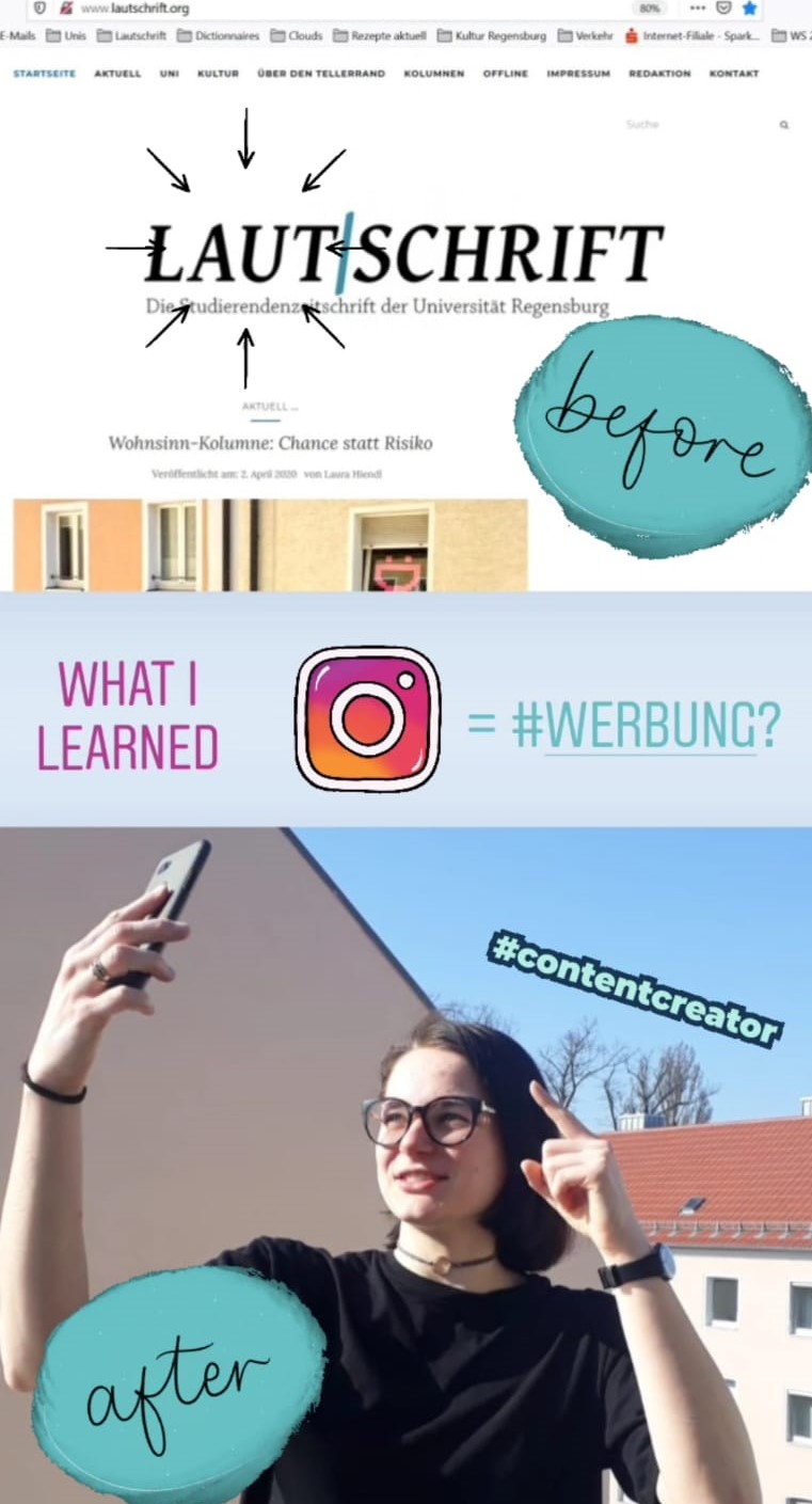 So habe ich vor einem Semester etwas blauäugig beschlossen, mich um den verwaisten Instagram-Account der @lautschrift zu kümmern. Bevor ich jedoch auch nur einen Gedanken an die zum Teil komplexen Möglichkeiten dieses Digitaldschungels verschwenden konnte, musste ich mit Babysteps anfangen, wie überhaupt mal wieder Artikel posten und die in Stories anteasern. Das #takeover beim @uniregensburg Account war da echt schon ein großer Schritt. Und auch die Follower*innen-Zahlen steigen so langsam. Alles aber noch nichts im Vergleich dazu, was Instagram zu bieten hat. Da habe ich bisher nur an der obersten Schicht eines fetten Eisberges gekratzt.